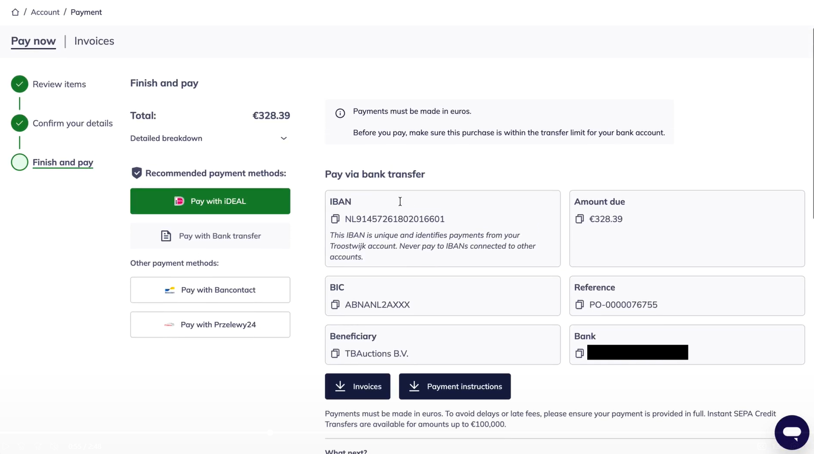 Wenn Sie eine Rechnung erhalten möchten, wählen Sie 'Banküberweisung'. Ihre Rechnung und die Zahlungsanweisungen erscheinen dann auf der rechten Seite der Seite. Sofort-SEPA-Überweisungen sind für Beträge bis zu 100.000 € verfügbar. Wenn Sie mit iDEAL, Bancontact oder Przelewy24 bezahlen, werden Sie zum entsprechenden Zahlungsanbieter weitergeleitet.