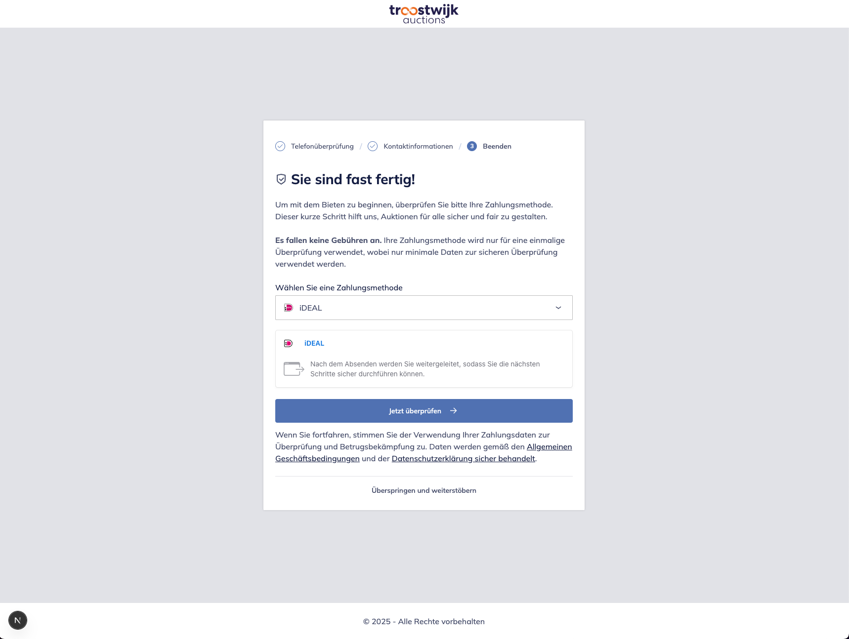 Um unsere Auktionen sicher zu halten und Betrug zu verhindern, bitten wir private Käufer, beim Erstellen ihres Profils eine gültige Zahlungsmethode zu bestätigen. Dieser Schritt dient ausschließlich Sicherheitszwecken es werden keine Kosten berechnet. Es ist erforderlich, diesen Schritt abzuschließen, bevor Sie an unseren Auktionen teilnehmen können. So wird ein sicherer und fairer Bietprozess gewährleistet.