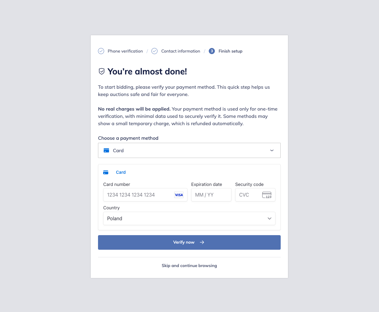 To keep our auctions safe and prevent fraud, we ask private buyers to confirm a valid payment method when creating their profile on our platform. This step is for security purposes only and no charges will be made. It is necessary to complete this step before you can place bids in our auctions. This ensures a safer and fairer bidding process.