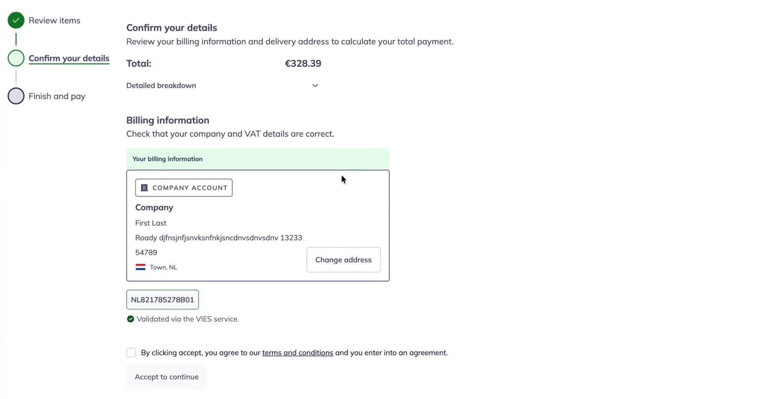Sur la page suivante, vous pouvez vérifier les informations de votre facture. Assurez-vous que toutes les informations sont correctes et modifiez-les si nécessaire. La TVA sera calculée sur la base de ces informations pour les lots à payer. Une fois votre facture créée, il ne sera plus possible de modifier les informations de facturation. Si tout est correct, acceptez les conditions générales et cliquez sur 'Accepter et continuer'.
