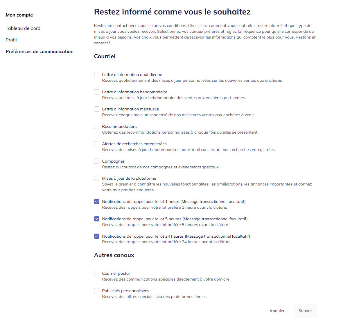 Recevez-vous trop d’e-mails, ou aucun, et souhaitez-vous modifier cela ? Vous pouvez définir vos préférences pour les newsletters et les alertes de recherche. Vous ne pouvez pas vous désinscrire des autres e-mails (tels que la confirmation de lot ou les rappels de paiement).