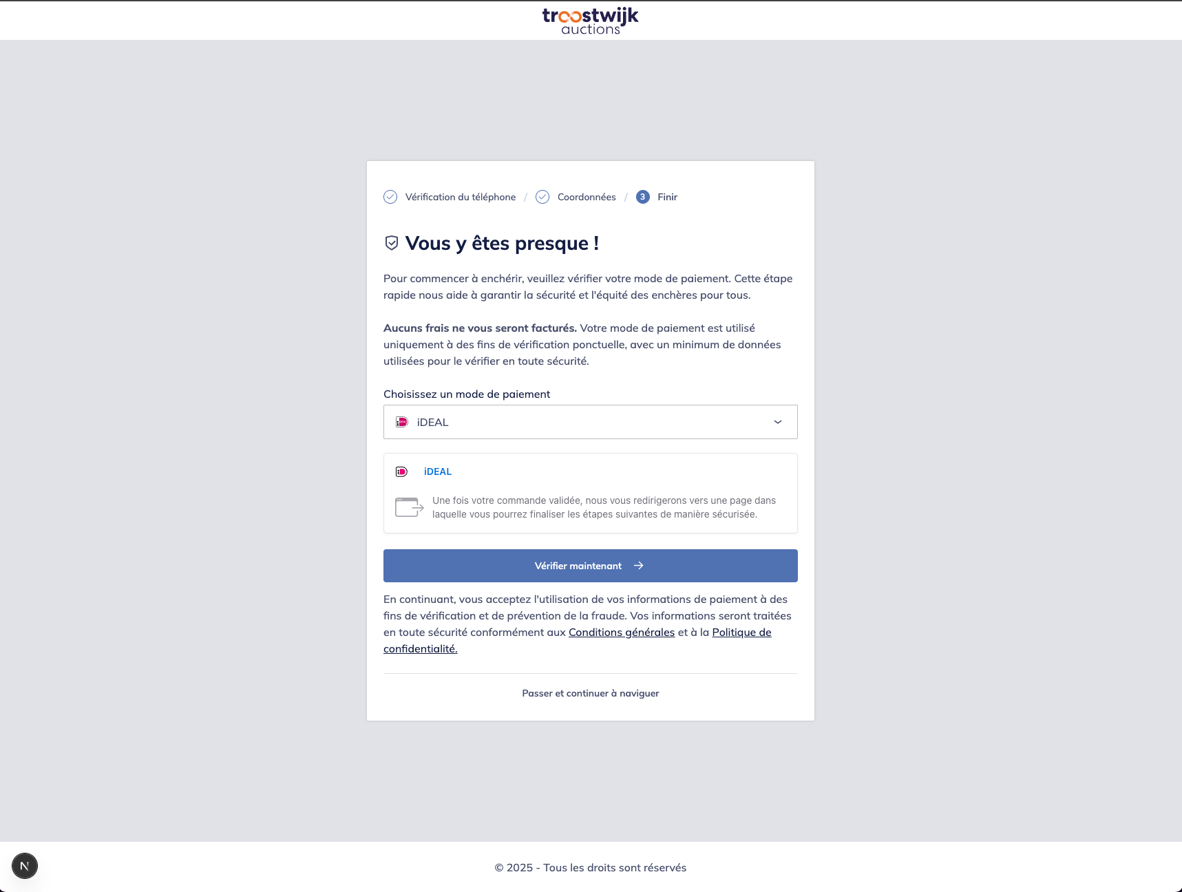 Afin de garantir la sécurité de nos ventes aux enchères et de prévenir la fraude, nous demandons aux acheteurs particuliers de confirmer un mode de paiement valide lors de la création de leur profil sur notre plateforme. Cette étape est uniquement destinée à des fins de sécurité aucun montant ne sera débité. Il est nécessaire de terminer cette étape avant de pouvoir enchérir dans nos ventes aux enchères. Cela permet d’assurer un processus d’enchère plus sûr et plus équitable.