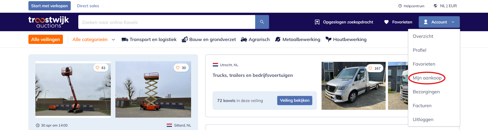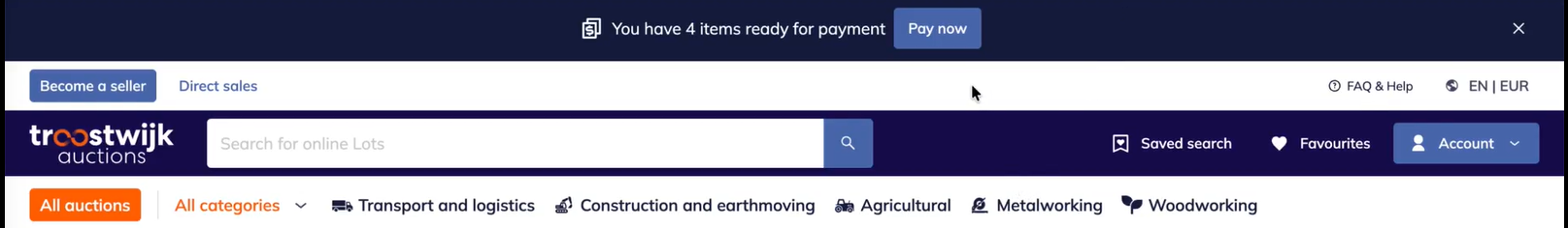 Per pagare i tuoi lotti, vai prima su Troostwijkauctions.com ed effettua l’accesso con i tuoi dati. Se hai lotti da pagare, apparirà un pop-up nella parte superiore della pagina con 'Paga ora'.