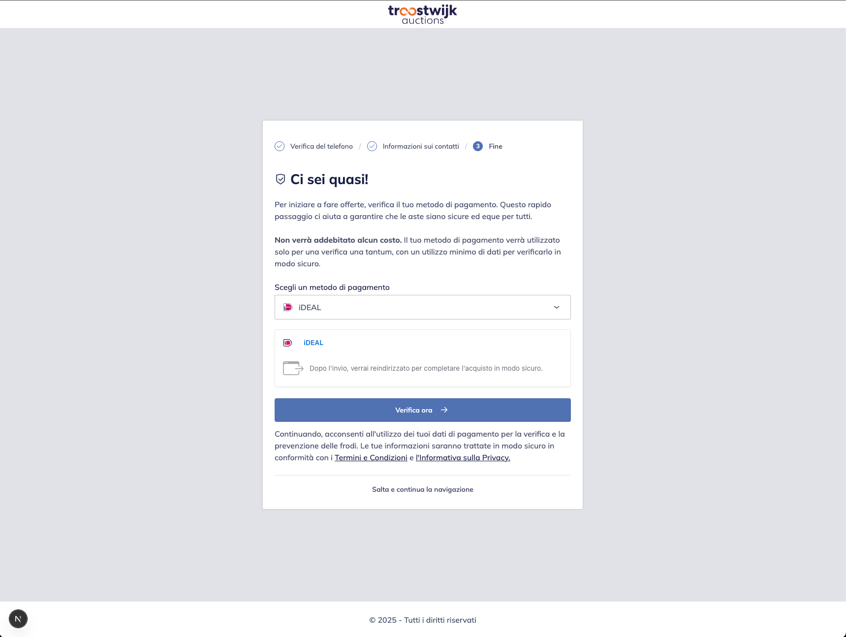 Per mantenere le nostre aste sicure e prevenire le frodi, chiediamo agli acquirenti privati di confermare un metodo di pagamento valido al momento della creazione del profilo sulla nostra piattaforma. Questo passaggio serve esclusivamente a fini di sicurezza non verrà addebitato alcun costo. È necessario completare questo passaggio prima di poter fare offerte nelle nostre aste. In questo modo garantiamo un processo d’asta più sicuro e trasparente.