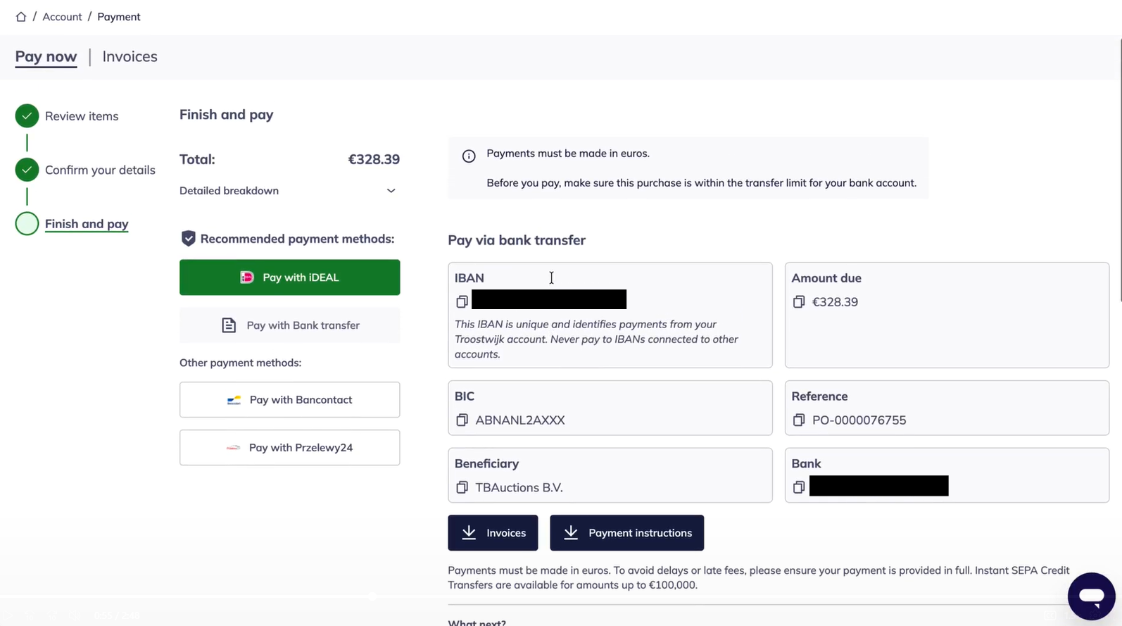 Indien u een factuur wenst te ontvangen, kies dan voor 'Bankoverschrijving'. Op de rechterkant van de pagina verschijnt dan uw factuur en de betaalinstructies. Instant SEPA-overboekingen zijn beschikbaar voor bedragen tot €100.000. Als u met iDEAL, Bancontact of Przelewy24 betaalt, wordt u doorgestuurd naar betreffende betaaldienst.